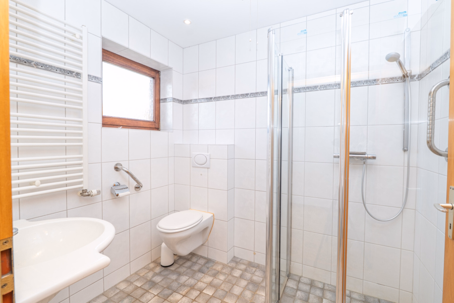 Schon beim Eintreten empfängt Sie ein heller, gefliester Eingangsbereich, der als zentrale Verbindung aller Räume im Erdgeschoss dient und ausreichend Platz für eine Garderobe bereithält. Zur linken Seite liegt das modern gestaltete Badezimmer in zeitloser Grau-Weiß-Optik. Ausgestattet mit Fußbodenheizung, bodengleicher Dusche, Fenster und Lüftung erfüllt es höchste Ansprüche an Komfort und Funktionalität. Rechts befindet sich ein vielseitig nutzbares Zimmer mit Teppichboden, das sich hervorragend als Schlaf-, Gäste- oder Arbeitszimmer eignet.