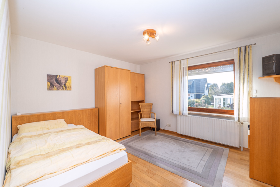 Über wenige Stufen erreichen Sie das nächste Halbgeschoss der Split-Level-Bauweise. Hier sorgt ein hochwertiger Echtholzboden für ein warmes und behagliches Wohngefühl. Mehrere gut geschnittene, lichtdurchflutete Räume bieten vielseitige Nutzungsmöglichkeiten: Ein Schlafzimmer lädt zum Entspannen ein, während ein weiteres großzügiges Zimmer zusätzlichen Rückzugsraum bietet.