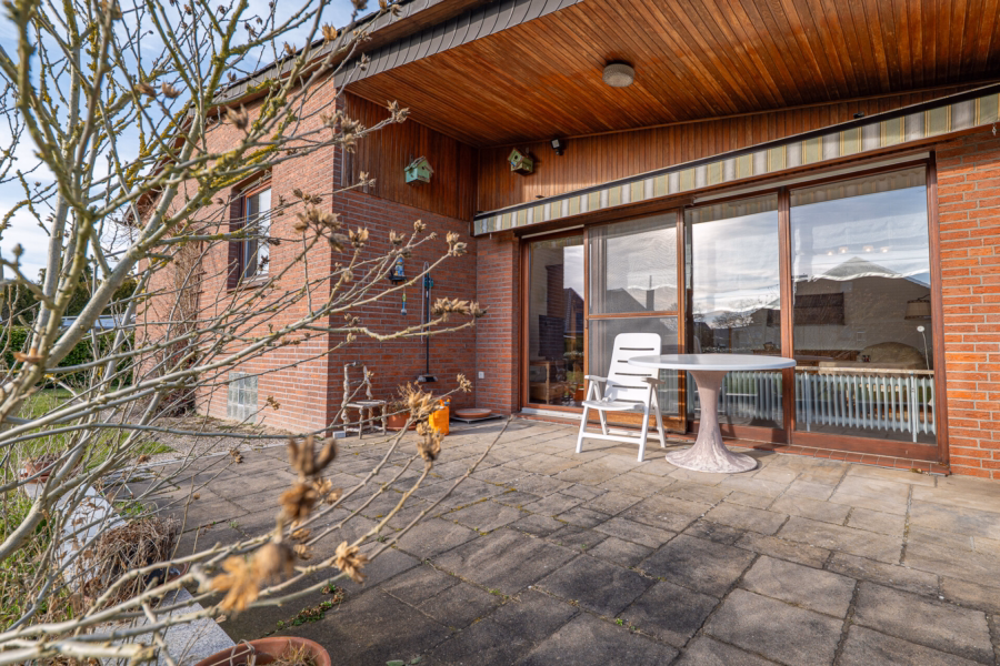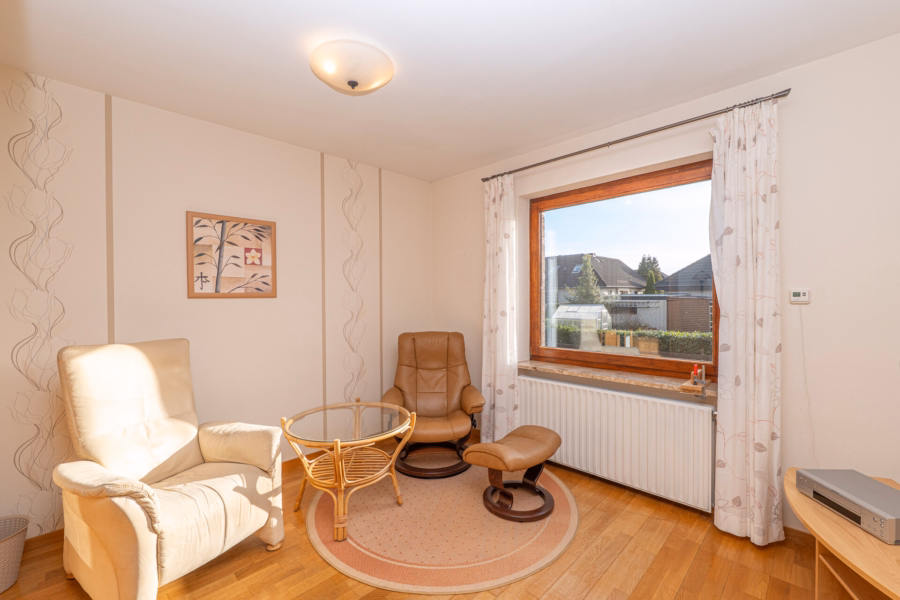 Vom Flur aus gelangen Sie in das weitläufige Wohnzimmer, das dank des Zugangs zur teilweise überdachten Terrasse ein harmonisches Zusammenspiel von Innen- und Außenbereich ermöglicht. Elektrische Außenrollläden, eine elektrische Markise sowie ein Windschutz auf der Terrasse sorgen für zusätzlichen Komfort. Ein zweizügiger Schornstein eröffnet zudem die Möglichkeit, einen Kamin zu installieren und so eine besonders gemütliche Atmosphäre zu schaffen.