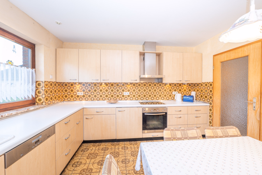 Die großzügige Küche ist gefliest, bietet Raum für einen Essplatz und ist mit elektrischen Rollläden ausgestattet. Ein direkt angrenzender Vorratsraum mit Anschlüssen für Waschmaschine und Trockner ergänzt diesen Bereich praktisch und durchdacht.