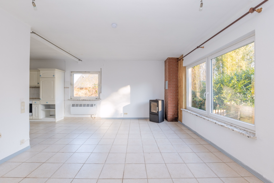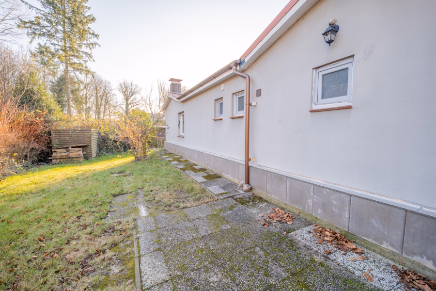 Willkommen in diesem einladenden Bungalow aus dem Jahr 1976, der auf ca. 65 m² Wohnfläche eine gemütliche und zugleich durchdachte Raumaufteilung bietet. Das großzügige Grundstück von ca. 843 m² lässt viel Platz für Entspannung, Spiel und kreative Gestaltung – hier können kleine Träume groß werden. Beim Betreten des Hauses empfängt Sie ein heller, freundlicher Flur, von dem alle Räume gut erreichbar sind. Zur linken Seite liegt das geräumige Schlafzimmer, ausgestattet mit einem praktischen Abteil für Waschmaschine und Trockner. Geradeaus gelangen Sie in das helle Badezimmer mit Dusche sowie das separate WC, die den Alltag besonders praktisch machen. Der offene Wohn- und Essbereich auf der rechten Seite ist das Herzstück des Hauses: lichtdurchflutet, mit großer Fensterfront, hellen Fliesen und einem fließenden Übergang zur offenen Küche. Von hier aus erreichen Sie ein weiteres Zimmer, das sich hervorragend als zweites Schlafzimmer, Büro oder Rückzugsort nutzen lässt. Der Außenbereich ist ein echtes Highlight: der weitläufige, liebevoll angelegte Garten bietet zahlreiche Möglichkeiten, sich zurückzuziehen, zu gärtnern oder gemütliche Abende im Freien zu verbringen. Hinten am Grundstück gibt es eine Zufahrt, sowie einen praktischen Schuppen für Fahrräder und Gartengeräte. Besondere Modernisierungen unterstreichen den gepflegten Zustand dieses Hauses: eine Horizontalsperre, Außendämmung von Sockel und Wänden, Kalziumsilikatplatten zur Feuchtigkeitsregulierung sowie nachträglich gedämmte Elektroheizungen in allen Räumen sorgen für ein angenehmes Wohnklima – ruhig, warm und behaglich. Dieser Bungalow vereint praktische Funktionalität, Charme und ein besonderes Wohngefühl – ein Zuhause, das Herz und Sinne gleichermaßen anspricht. Alle Angaben erfolgen zunächst ohne Gewähr, da noch keine endgültigen Unterlagen vorliegen. Der Energieausweis ist beantragt.