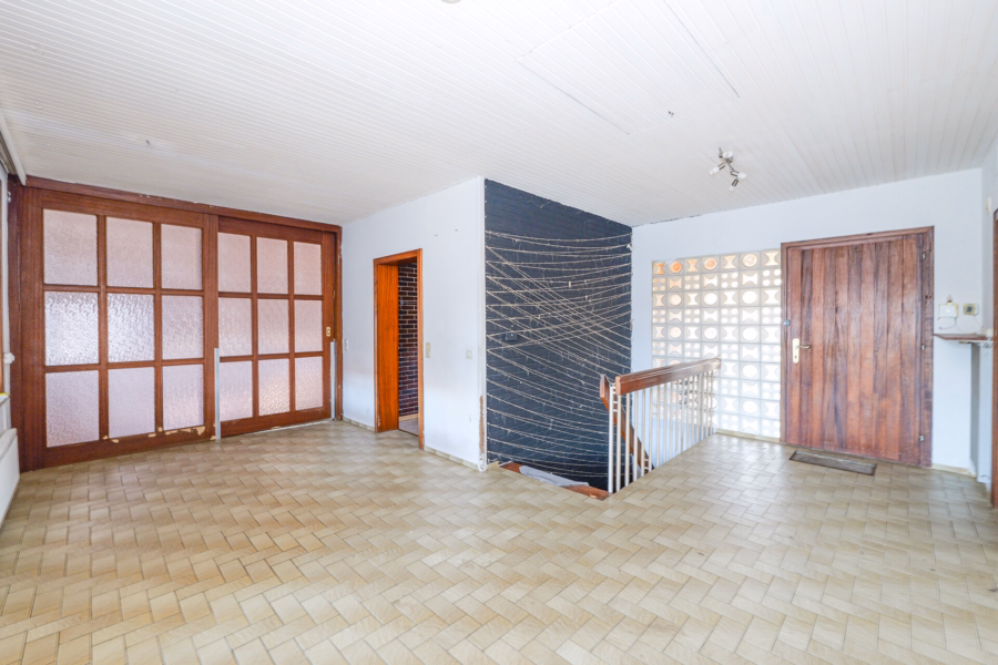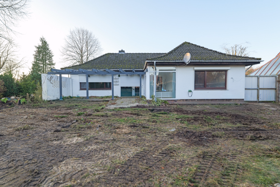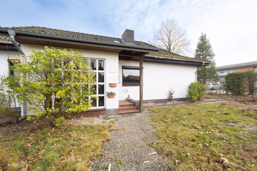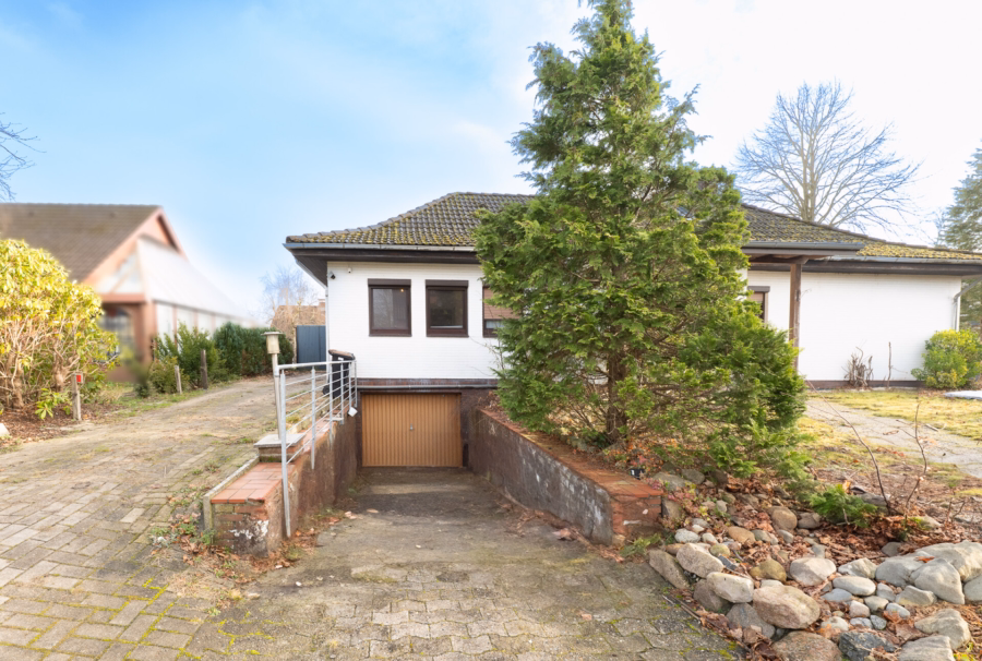 Dieser charmante, familienfreundliche Bungalow wurde 1970 auf einem ca. 1.002 m² großen Grundstück in ruhiger, dennoch zentraler Lage erbaut. Ihr Fahrzeug parken Sie bequem auf der großzügigen Auffahrt oder geschützt in der hauseigenen Tiefgarage. Über wenige Stufen gelangen Sie zur Haustür, die Sie in einen einladenden Windfang mit großer Fensterfront führt. Hier lässt sich eine großzügige Garderobe integrieren. Von diesem zentralen Bereich aus gelangen Sie in die Diele, die als Herzstück des Hauses alle Wohnbereiche miteinander verbindet. Auf der linken Seite befindet sich ein modernisiertes Gäste-WC mit zeitlosem Design. Rechts schließt die ca. 7 m² große, funktional ausgestattete Küche an, die genügend Arbeitsfläche bietet. Direkt daneben liegt das ca. 29 m² große Wohnzimmer – das Herzstück des Hauses. Ein vor drei Jahren installierter Kaminofen sorgt in den kalten Monaten für wohlige Wärme und spart gleichzeitig Heizkosten. Helle Laminatböden und große Fensterflächen schaffen eine freundliche, lichtdurchflutete Atmosphäre. Der Schlaftrakt auf der linken Seite überzeugt mit zwei geräumigen Zimmern: einem ca. 12 m² großen Kinderzimmer und einem ca. 21 m² großen Schlafzimmer, die viel Platz für individuelle Gestaltungsmöglichkeiten bieten. Dazwischen liegt das modern ausgestattete Badezimmer mit ebenerdiger Dusche, großen Fliesen und praktischem Handtuchheizkörper – ein Ort zum Wohlfühlen. Abgerundet wird das Erdgeschoss durch einen Wintergarten mit direktem Zugang zum Garten. Das weitläufige Grundstück bietet zahlreiche Möglichkeiten, ein individuelles Gartenparadies zu gestalten. Eine bereits überdachte Terrasse ermöglicht einen geschützten Freisitz mit wenigen Handgriffen. Für zusätzlichen Stauraum sorgt der Keller, in dem auch die Gaszentralheizung aus dem Jahr 2021 untergebracht ist. Wer zusätzlichen Wohnraum wünscht, kann das Dachgeschoss ausbauen. Überzeugen Sie sich selbst von dieser zukunftssicheren Immobilie und vereinbaren Sie noch heute einen Besichtigungstermin!
