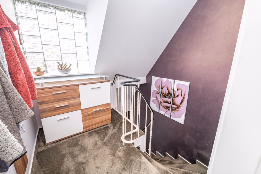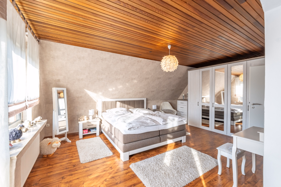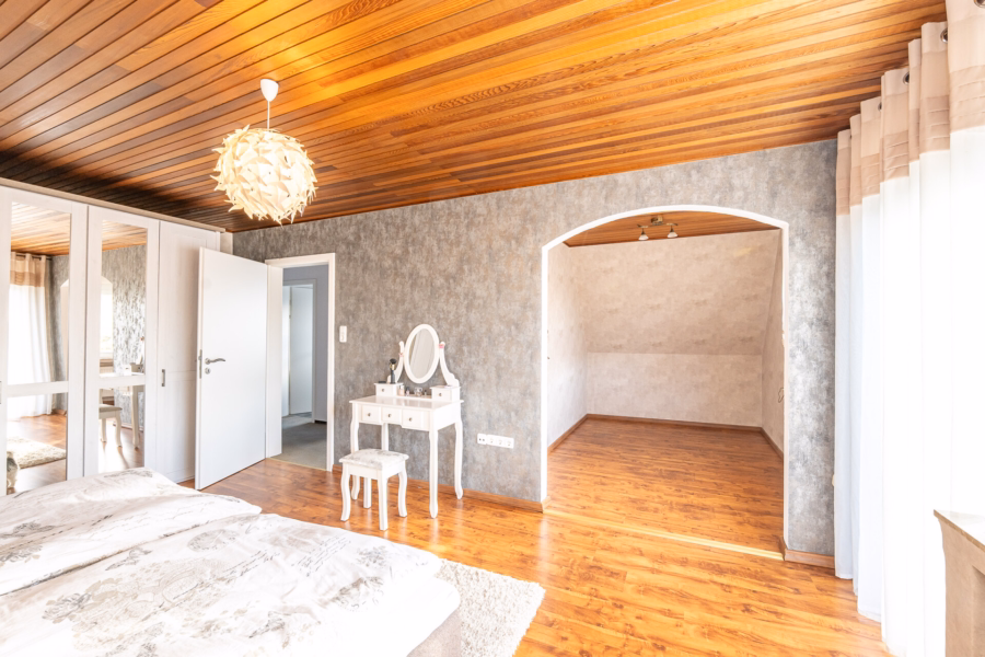 Über eine Holzteppich gelangt man in das Obergeschoss, wo sich der wohnliche Charakter des Hauses nahtlos fortsetzt. Hier erwartet Sie ein großzügiges Hauptschlafzimmer, das mit einer zusätzlichen Ankleide oder einer kleinen Büroecke flexibel genutzt werden kann und zudem direkten Zugang zu einem gemütlichen Balkon bietet.