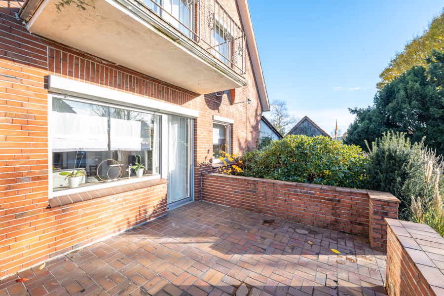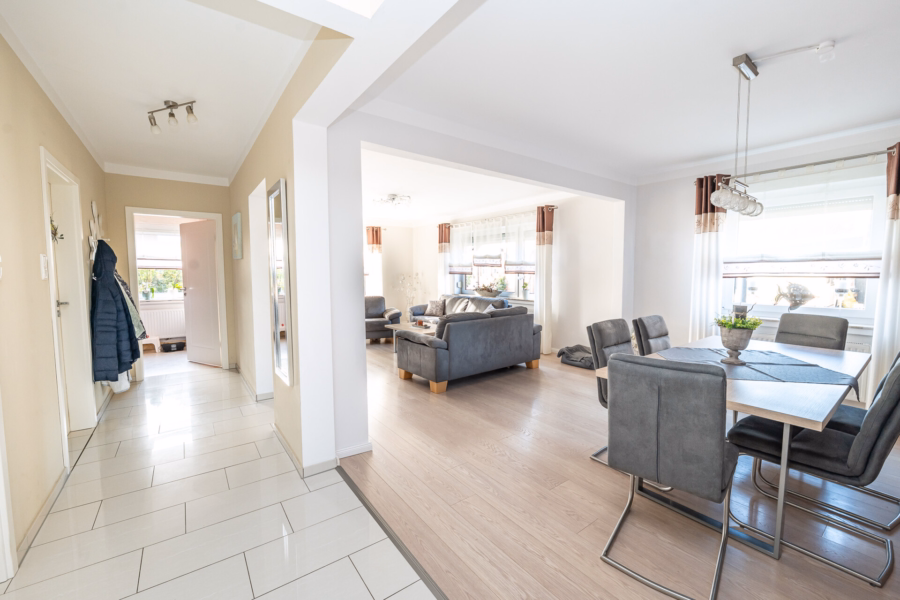 Schon beim Betreten empfängt Sie ein stilvoller Windfang, der nahtlos in den zentralen Flur übergeht. Geradeaus öffnet sich der Wohnbereich und entfaltet einen offen gestalteten Wohn- und Essbereich, der sofort ein Gefühl von Großzügigkeit vermittelt. Große Fensterflächen lassen viel Tageslicht herein und schaffen eine warme, einladende Atmosphäre. Vom Wohnzimmer aus gelangt man auf eine hübsche Terrasse, die sich ideal für gesellige Grillabende oder entspannte Stunden im Freien eignet.