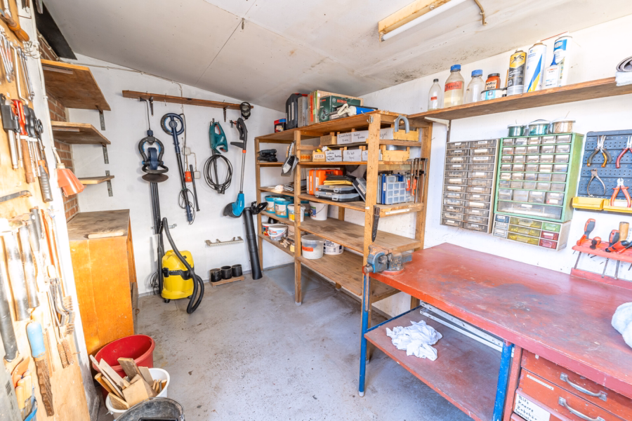 Ein echtes Highlight ist das vielseitige Nebengebäude, das als Garage und Doppel-Carport genutzt werden kann und zudem mehrere Funktionsräume umfasst. Dazu gehören ein beheizbarer Partyraum, ein weiterer Hauswirtschaftsraum mit Wasseranschluss, eine kleine Vorratskammer sowie eine professionelle, ebenfalls beheizbare Werkstatt mit Starkstromanschluss, die besonders für Handwerker und Hobbybastler von großem Wert ist.