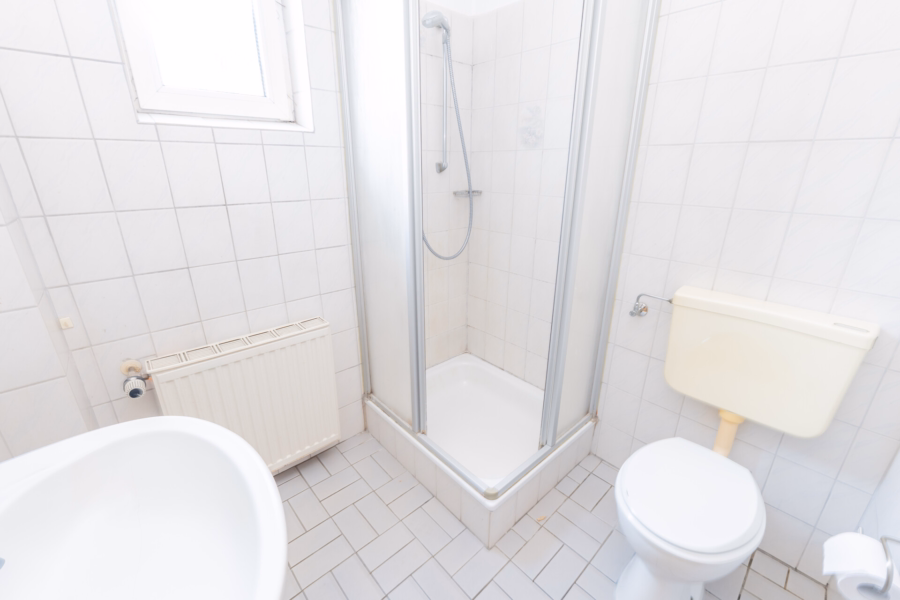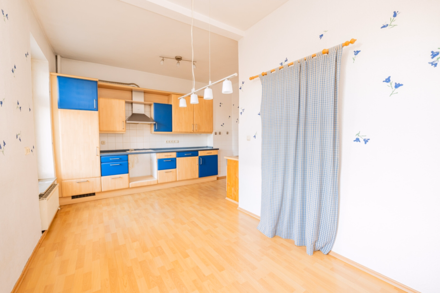 Rechts vom Flur befindet sich ein gut geschnittenes Arbeitszimmer, das vielseitig nutzbar ist und ebenfalls von den hohen Decken und dem Holzboden profitiert. Im weiteren Verlauf des Flures gelangt man in die Küche, die ausreichend Platz für eine große Essecke bietet. Angrenzend befindet sich ein separater Vorratsraum, der zusätzlichen Stauraum für Lebensmittel oder Haushaltsutensilien schafft. Am Ende des Flures liegt ein Badezimmer mit Dusche, das in einem neutralen, zeitlosen Weiß gehalten ist.