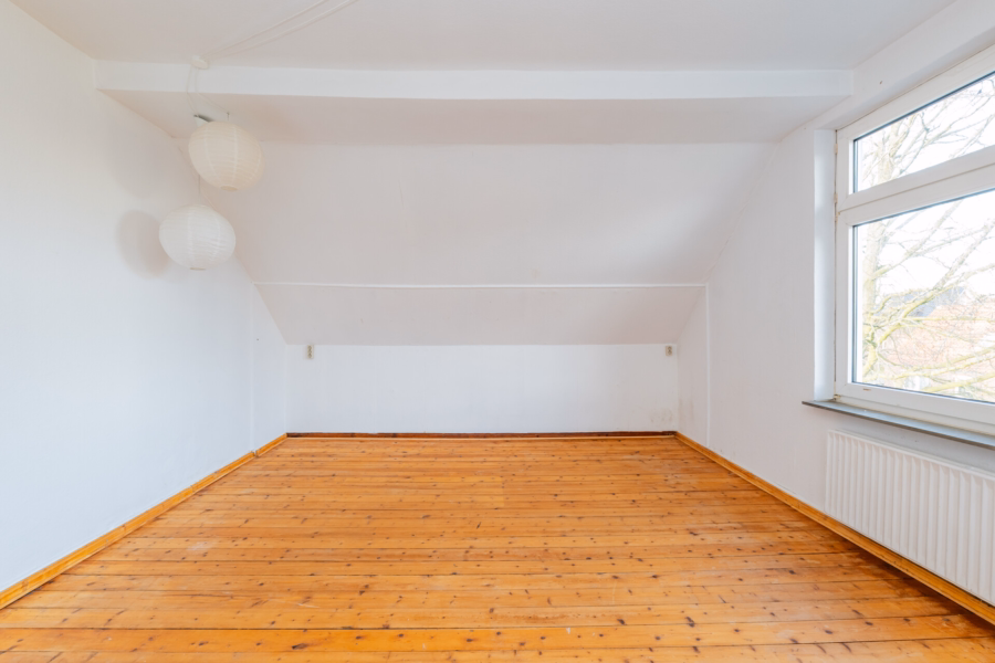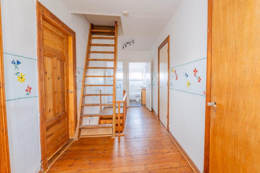 Über eine Holztreppe erreicht man das Obergeschoss. Hier stehen vier geräumige Zimmer zur Verfügung, die sich flexibel als Schlaf-, Kinder-, Gäste- oder Arbeitszimmer nutzen lassen. Alle Räume sind funktional geschnitten und durch große Fenster angenehm hell. Ergänzt wird diese Etage durch ein separates WC sowie ein weiteres Badezimmer mit Dusche und Badewanne. Von dort aus besteht ein Durchgang zu einem zusätzlichen kleinen Raum, der sich ideal als Ankleidezimmer nutzen lässt.