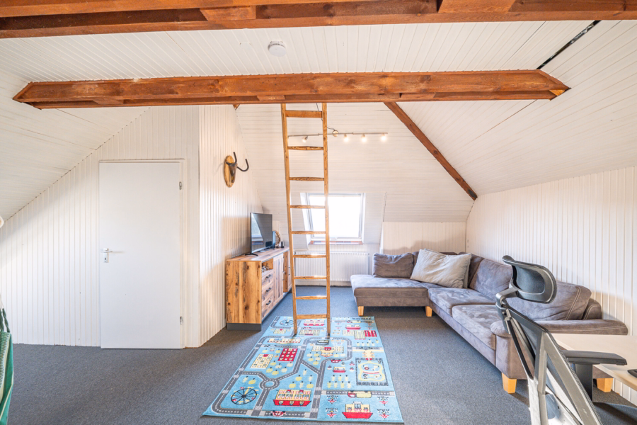 - Gemütlicher Raum im Obergeschoss mit offenen Balken und großen Dachflächenfenstern