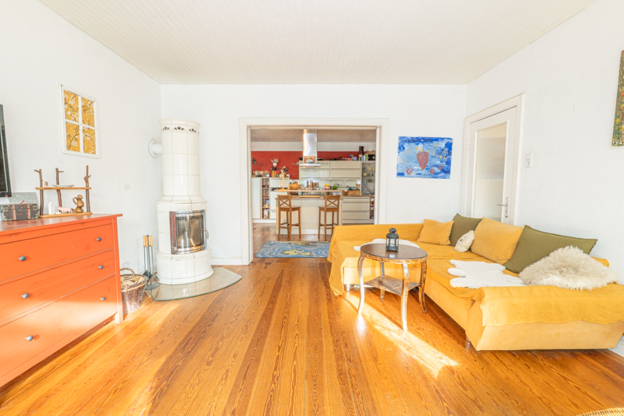 - großzügiger Wohn- und Essbereich mit Kamin und warmen Holzdielen