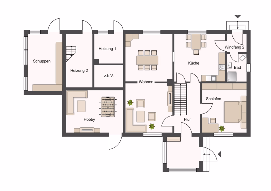 - Hauswirtschaftsraum (von außen zugänglich, ehemals Stall)