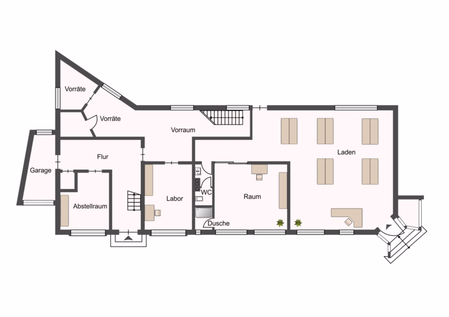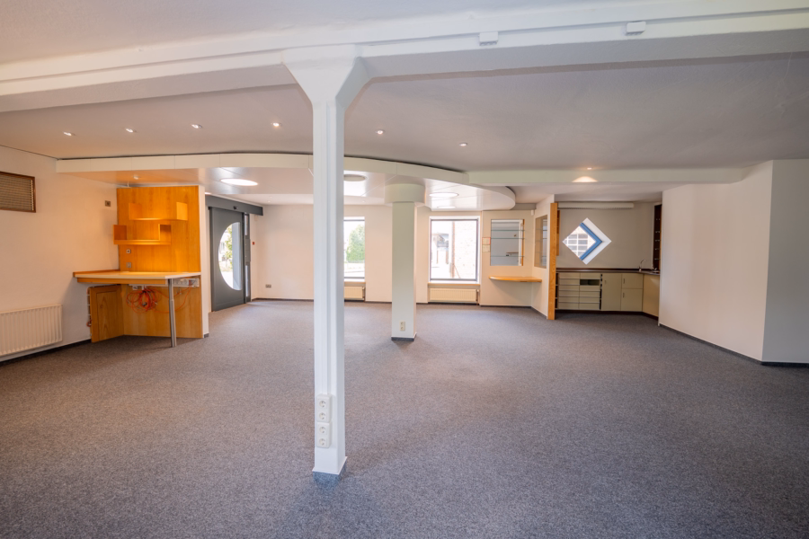 Der vordere Bereich des Hauses beherbergt eine großzügige Gewerbeeinheit, die zuletzt als Büro genutzt wurde. Der offen gestaltbare Verkaufsraum überzeugt mit einem freundlichen, lichtdurchfluteten Ambiente und mehreren kleinen Schaufenstern zur Straßenseite, die sich ideal zur ansprechenden Produktpräsentation und Dekoration eignen. Der Kundenbereich ist direkt zur Straße hin ausgerichtet und wirkt mit seinem separaten Eingangsbereich einladend und repräsentativ.