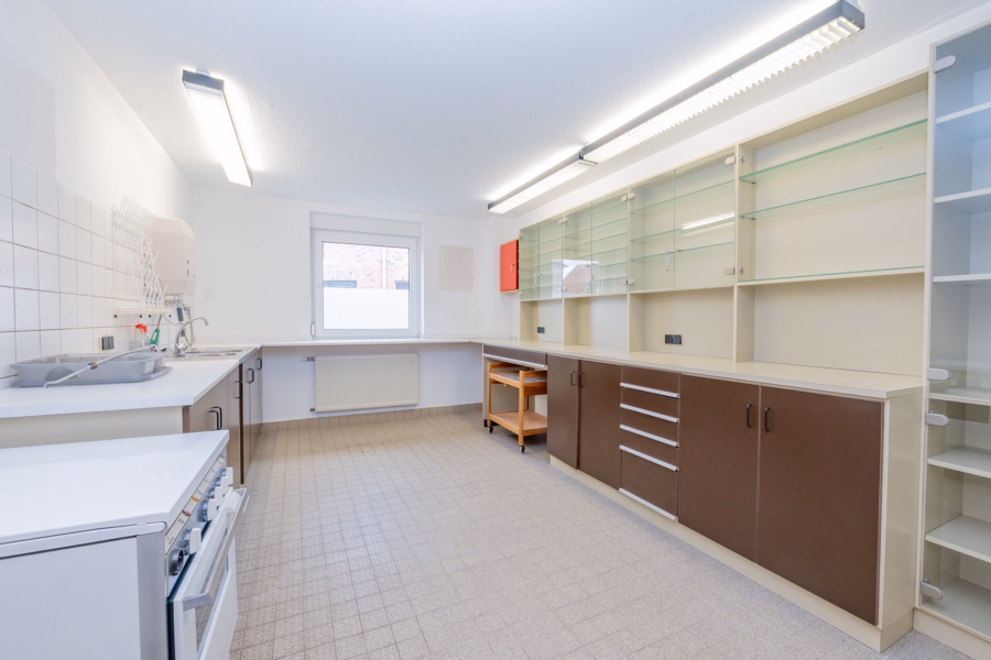 Geht man um das Haus herum, gelangt man zu einem separaten Seiteneingang, der den hinteren Teil des Erdgeschosses sowie das Obergeschoss erschließt. Im rückwärtigen Erdgeschossbereich befinden sich vier weitere Räume, darunter ein ehemaliges Labor, ein früheres Medikamentenlager und zusätzliche Räume, die sich ideal als Lager- oder Archivflächen eignen. Vom Flur aus führt eine Tür in den Teilkeller, in dem sich die Heizungsanlage befindet.