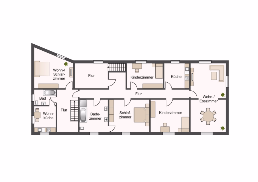 Im Obergeschoss befinden sich zwei eigenständige Wohneinheiten: Eine kompakte 1-Zimmer-Wohnung mit Küchenzeile und Badezimmer mit Badewanne sowie eine großzügige 4-Zimmer-Wohnung, die sich ideal für Familien eignet. Letztere bietet ein komfortables Badezimmer mit Dusche, Badewanne und Doppelwaschbecken, von dem aus direkt das Schlafzimmer zugänglich ist. Hinzu kommen zwei weitere, helle und gut geschnittene Zimmer, eine geräumige Küche und ein freundlicher Wohnbereich mit angrenzendem Esszimmer – perfekt zum Wohlfühlen.