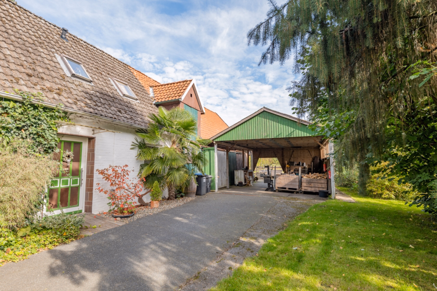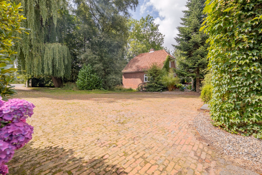 Die Einfahrt zum Grundstück ist durch ein großes Tor geschützt, das Privatsphäre schafft. Auf der großzügigen Hoffläche finden mehrere Fahrzeuge bequem Platz – ideal für Bewohner und Gäste.