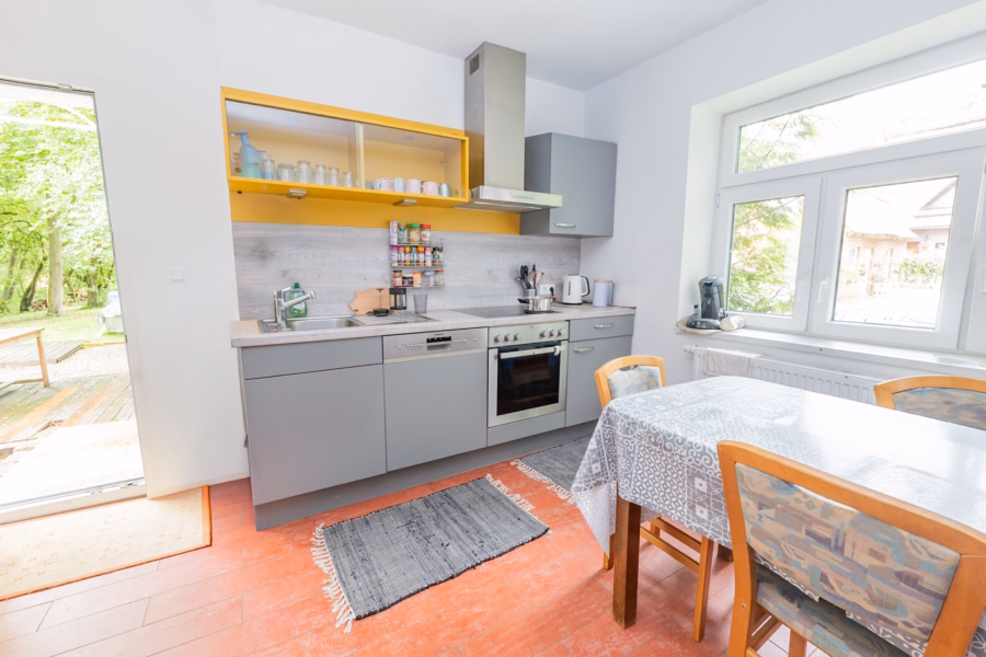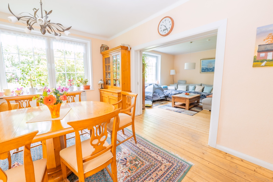 Das Haupthaus überzeugt mit einer durchdachten Aufteilung und einem gemütlichen Wohngefühl. Im Erdgeschoss empfängt Sie ein einladender Flur mit Kaminofen, von dem aus alle Räume erreichbar sind. Zur linken Seite befindet sich das helle Gäste-WC, während Sie geradeaus in die moderne Marken-Küche mit hochwertigen Einbaugeräten und weißen Fronten gelangen. Zwei praktische Vorratskammern bieten zusätzlichen Stauraum, und ein direkter Ausgang ins Freie sorgt für kurze Wege. Der angrenzende Wohn- und Essbereich ist großzügig und offen gestaltet, kann aber durch eine elegante Schiebetür auch getrennt werden.