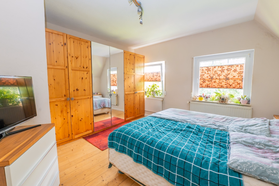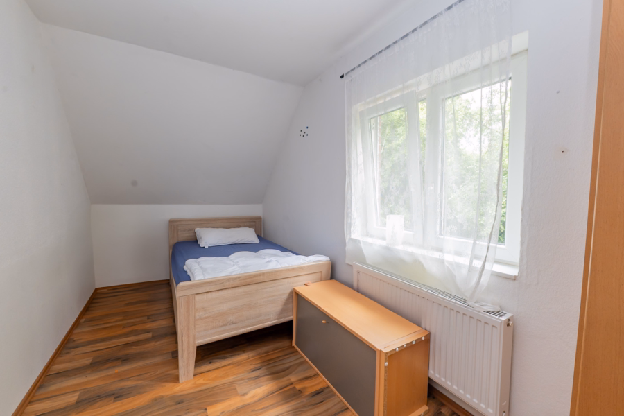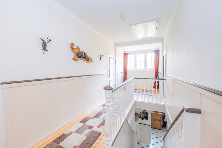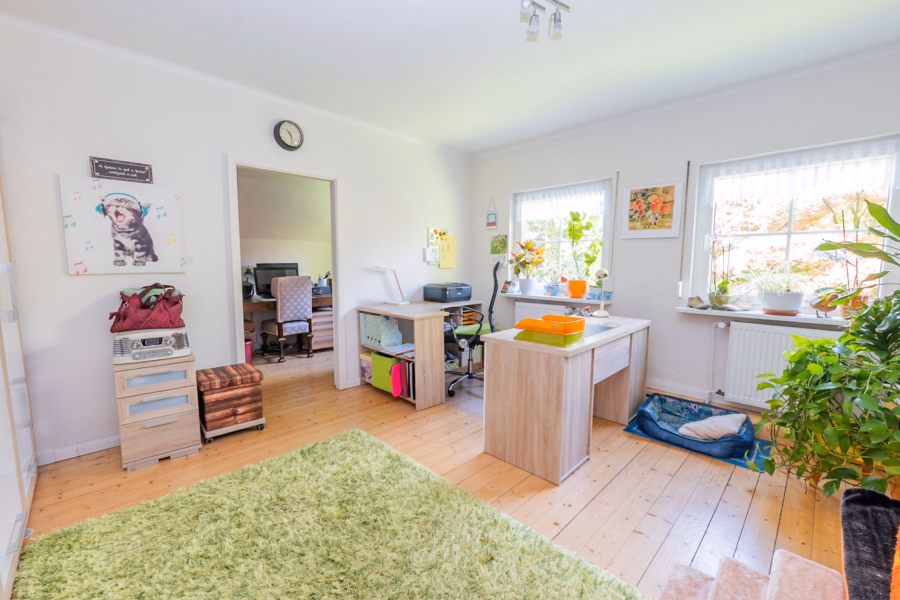 Im Obergeschoss befinden sich ein flexibel nutzbares Durchgangszimmer – derzeit als Büro und Schlafzimmer genutzt –, sowie ein modernes Tageslichtbad mit Fußbodenheizung, Wanne und bodengleicher Dusche. Dazu kommen ein separates Schlafzimmer und ein praktischer Hauswirtschaftsraum mit Waschmaschinenanschluss. Der Keller ist direkt von der Küche aus erreichbar und beherbergt neben Abstellflächen auch den Heizungsraum mit einer Ölheizung aus dem Jahr 2009.