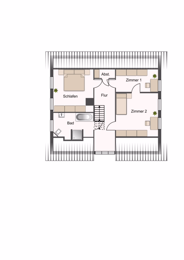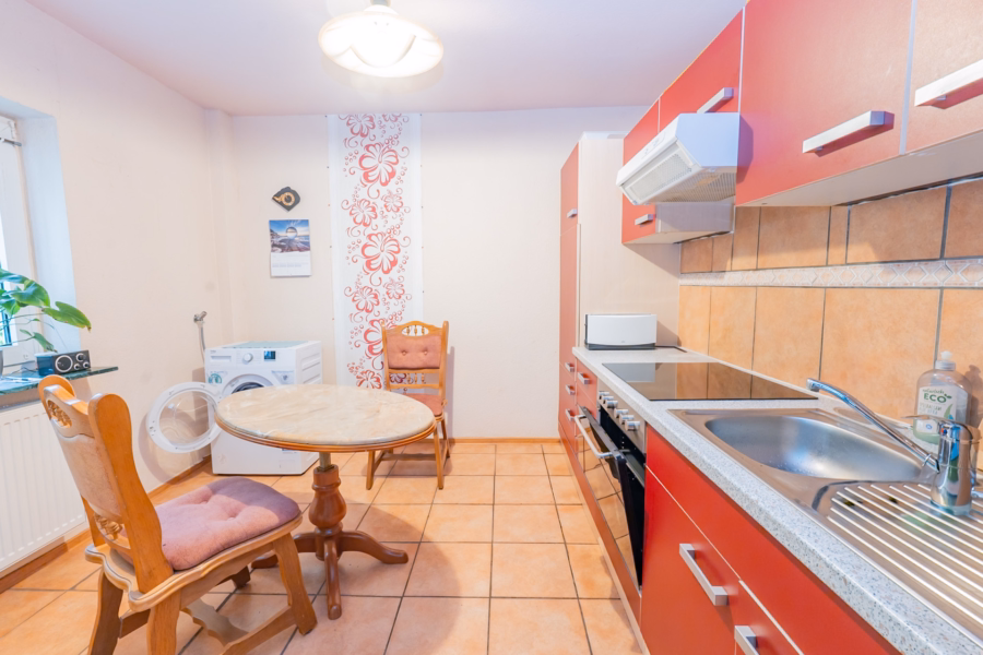 Das mittlere Gebäude beherbergt zwei vermietete Wohneinheiten. Die Wohnung im Erdgeschoss ist ca. 39 m² groß und als großzügige Einzimmerwohnung mit separatem Schlafbereich, Bad und Pantryküche gestaltet. Die zweite Wohnung mit ca. 55 m² erstreckt sich über zwei Etagen: Unten befinden sich Windfang und Küche, oben ein Wohnzimmer mit Zugang zur Loggia, ein Schlafzimmer sowie ein Badezimmer mit Wanne. In der oberen Etage befindet sich zusätzlich ein praktischer Abstellraum.