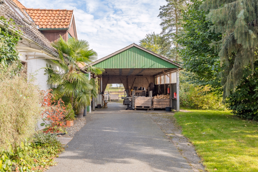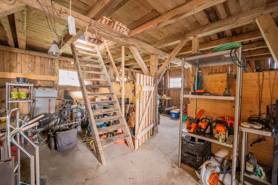 Eine angrenzende Werkstatt, die ursprünglich als Pferdestall diente, wird derzeit als Lagerfläche genutzt, bietet aber auch Raum für handwerkliche Hobbys oder kreative Projekte.