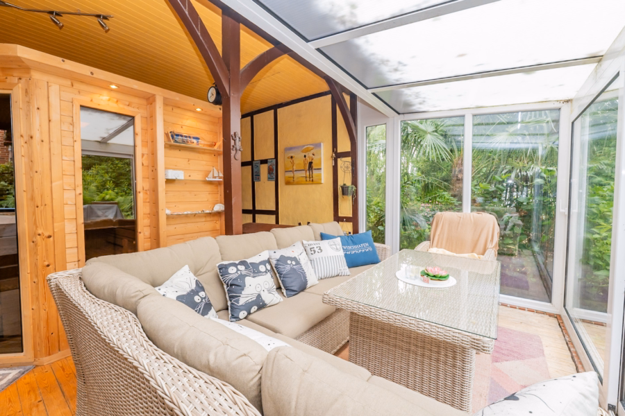 Ein echtes Highlight ist der separat zugängliche Wintergarten mit Sauna – hochwertig ausgestattet, mit viel Licht und Platz zum Durchatmen. Ergänzt wird das Raumangebot durch ein separates, beheizbares Büro im Außenbereich, das sich wunderbar als Arbeitszimmer, Atelier oder Studio eignet.