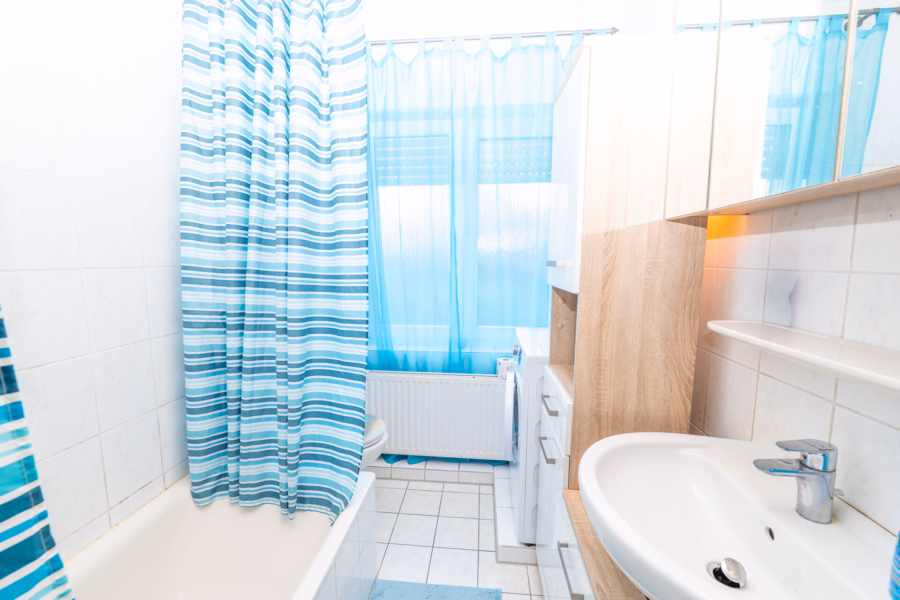 - Badezimmer mit Badewanne und Waschmaschinenanschluss