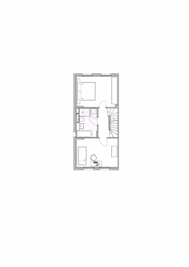 Über die Treppe gelangen Sie in das Obergeschoss, wo ein ca. 4 m² großer Flur alle Räume miteinander verbindet. Auf dieser Ebene befinden sich das Elternschlafzimmer (ca. 15 m²), ein Kinderzimmer (ca. 14 m²) sowie ein modernes Badezimmer (ca. 7 m²) mit Badewanne und Walk-In-Dusche mit Glastür.