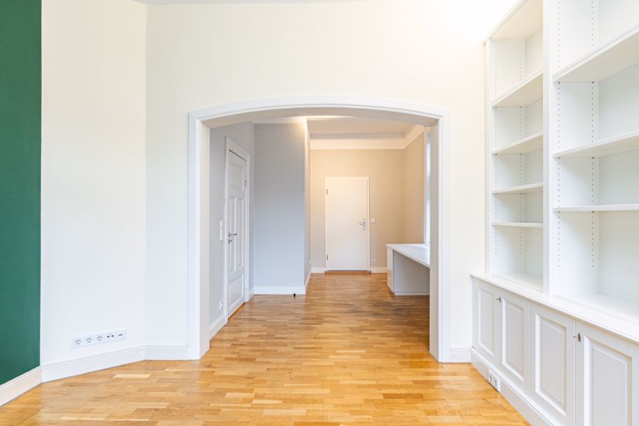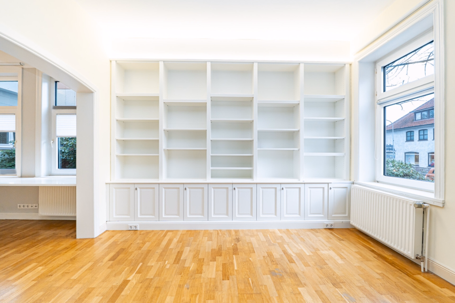 – Arbeitszimmer mit beleuchteter Bücherwand und hohen Decken