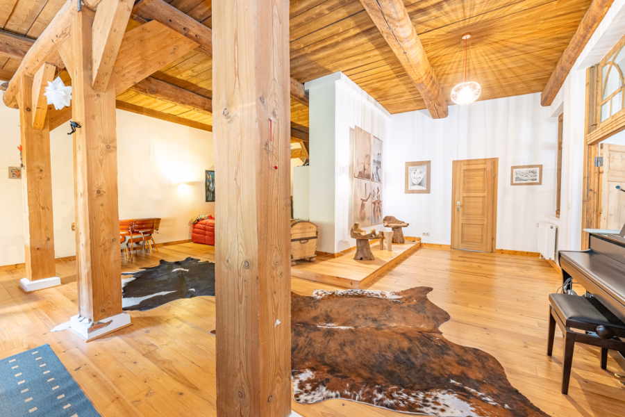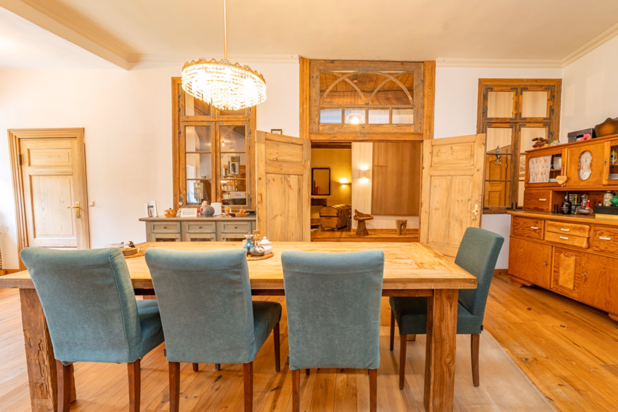 Das angrenzende Wohnzimmer, das durch eine beeindruckende Holztür betreten wird, strahlt eine warme und einladende Atmosphäre aus. Der originale Dielenboden und die sichtbaren Holzbalken unterstreichen den historischen Charakter und verleihen jedem Raum eine besondere Note. Das großzügige Wohnzimmer bietet reichlich Raum für kreative Gestaltungsmöglichkeiten, während der offene Kamin in den Wintermonaten wohlige Wärme und Gemütlichkeit verbreitet.