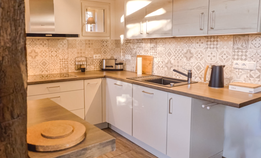 Die Küche wurde 2009 hochwertig renoviert und ist mit modernen Geräten ausgestattet, die das Kochen zu einem Vergnügen machen. Der direkte Zugang zur Terrasse ermöglicht es Ihnen, Ihre kulinarischen Kreationen im Freien zu genießen. Das stilvolle Badezimmer verfügt über eine bodentiefe Dusche und eine Badewanne, wobei die besonderen Fliesen das Gesamtbild abrunden.