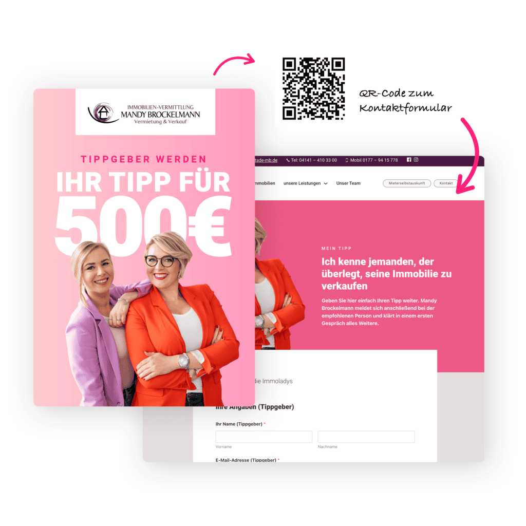 Wenn Sie jemanden an die Mandy Brockelmann Immobilien-Vermittlung weiterempfehlen – und die Immoladys verkaufen erfolgreich über Ihren Tipp ein Haus – bekommen Sie als Dankeschön 500 € Provision.
